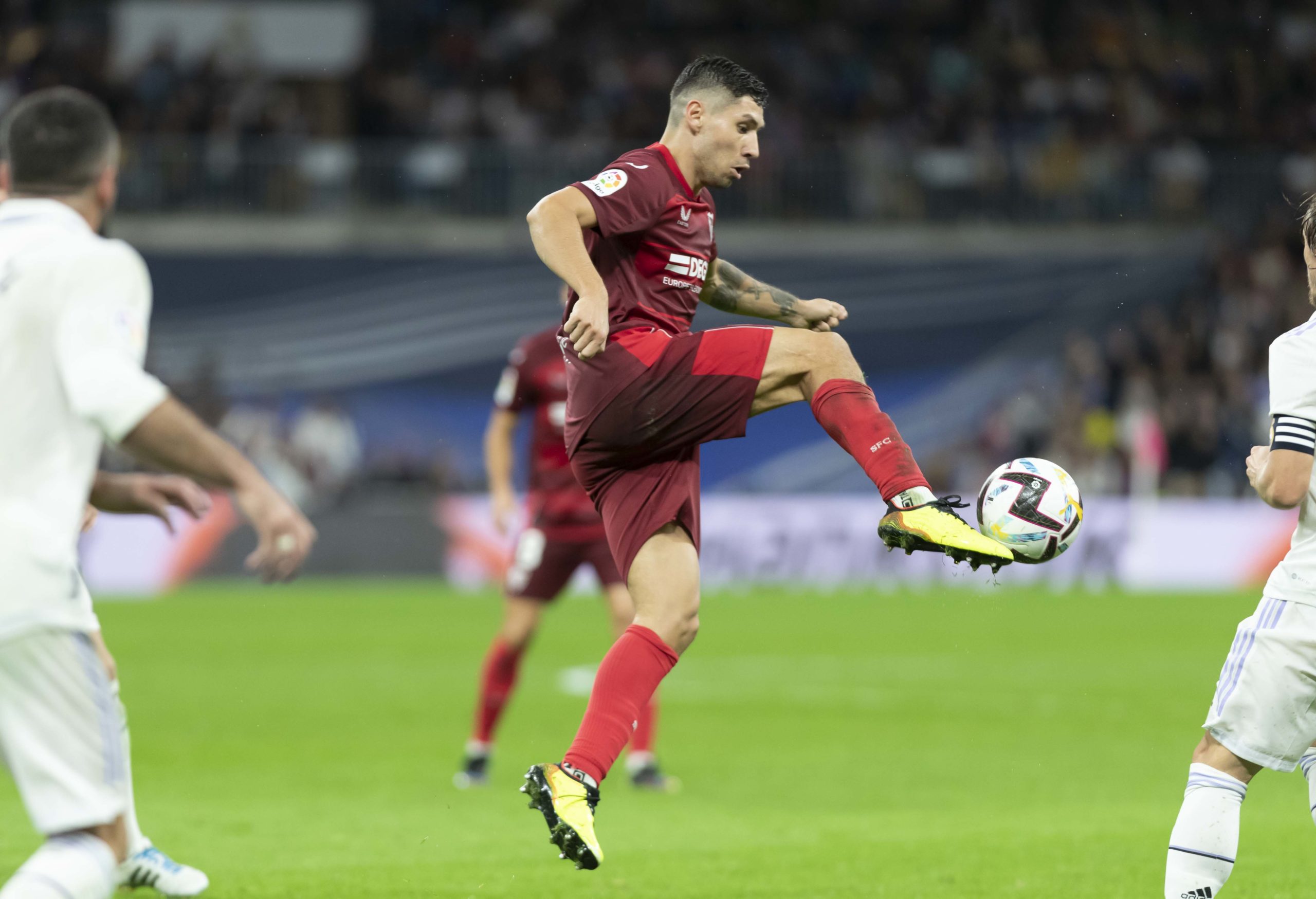 El lateral derecho del Sevilla FC hizo gala de una gran sangre fría para despistar al capitán de Francia,