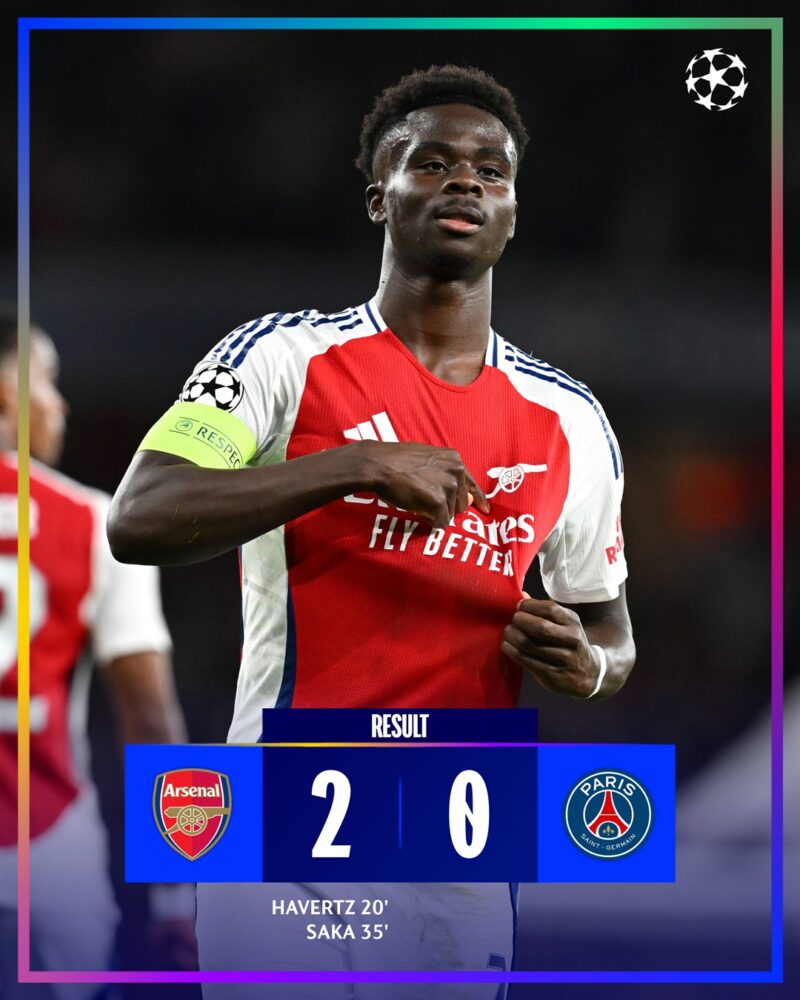 Fue la primera victoria del Arsenal en la competición después de que el equipo londinense empatara su primer partido contra el Atalanta el mes pasado. El PSG, que estaba invicto en todas las competiciones y comenzó con una victoria contra el Girona, sufrió su primera derrota.