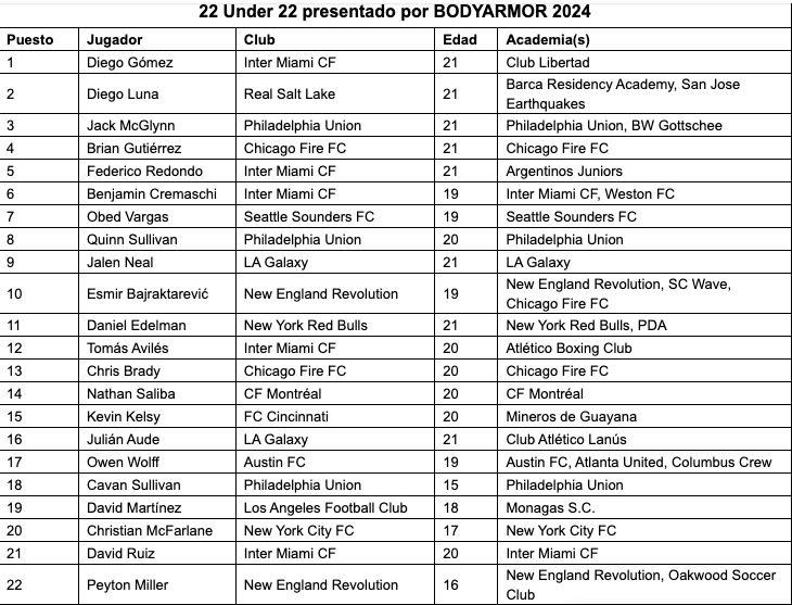 La lista de los 22 mejores Sub22 en la MLS
