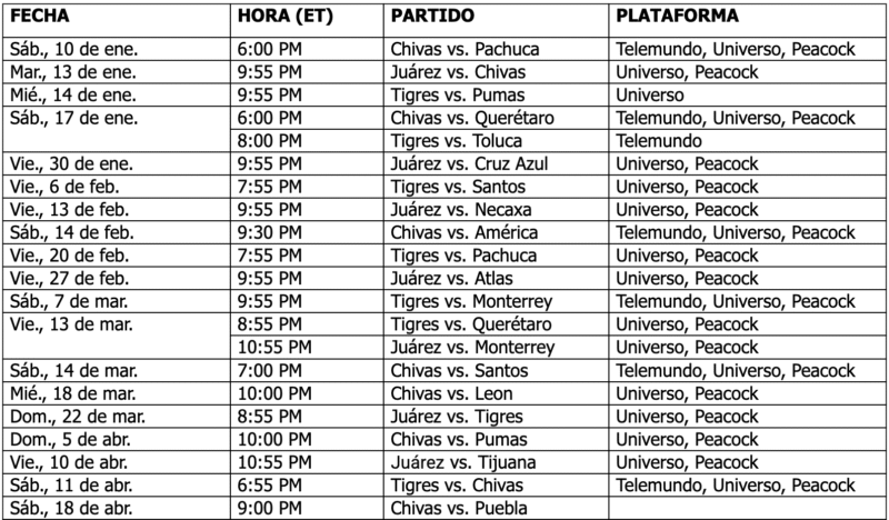 Telemundo también continuará brindando cobertura exclusiva en vivo de los partidos de Tigres Femenil, Juárez Femenil, Chivas Femenil y las categorías juveniles de Chivas a través de sus plataformas digitales.